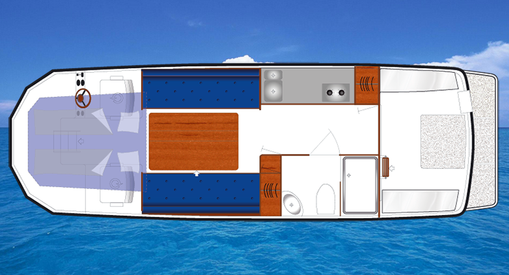 Im Vordergrund aller konzeptionellen Überlegungen stand, einen nach praktischen Gesichtspunkten gestylten, absolut problemlos zu handhabenden family-cruiser mit sicheren Fahreigen-schaften und Wurzeln in der skandinavischen Yachtbautradition auf Kiel zu legen, der alles in seiner Klasse ( 8 Meter) an Wohnraum und Komfort übertrifft: Stehhöhe in der gesamten Bootslänge, separate Duschnische, großzügige Pantry, edler Mahagoni-Echtholz-Innenausbau, 5 Schlafplätze, Doppel-Hub-Bett, flybridge, 2 Steuerstände, Sonnendeck, Reisegeschwindigkeit bis 23 kn ( u. v. m.).
